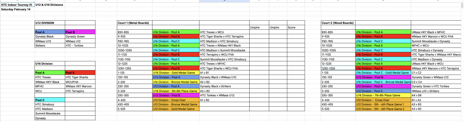 11:00-11:25 (Court #2): HTC Tiger Sharks vs WMASS HKY Maroon12:00-12:25 Now 12:30-12:55 (Court #2): WMASS HKY Maroon vs HTC Terrapins